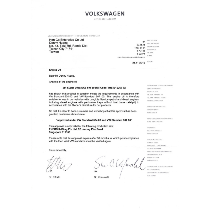 VW 504.00/507.00 認證通過