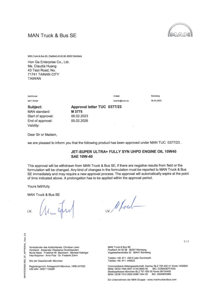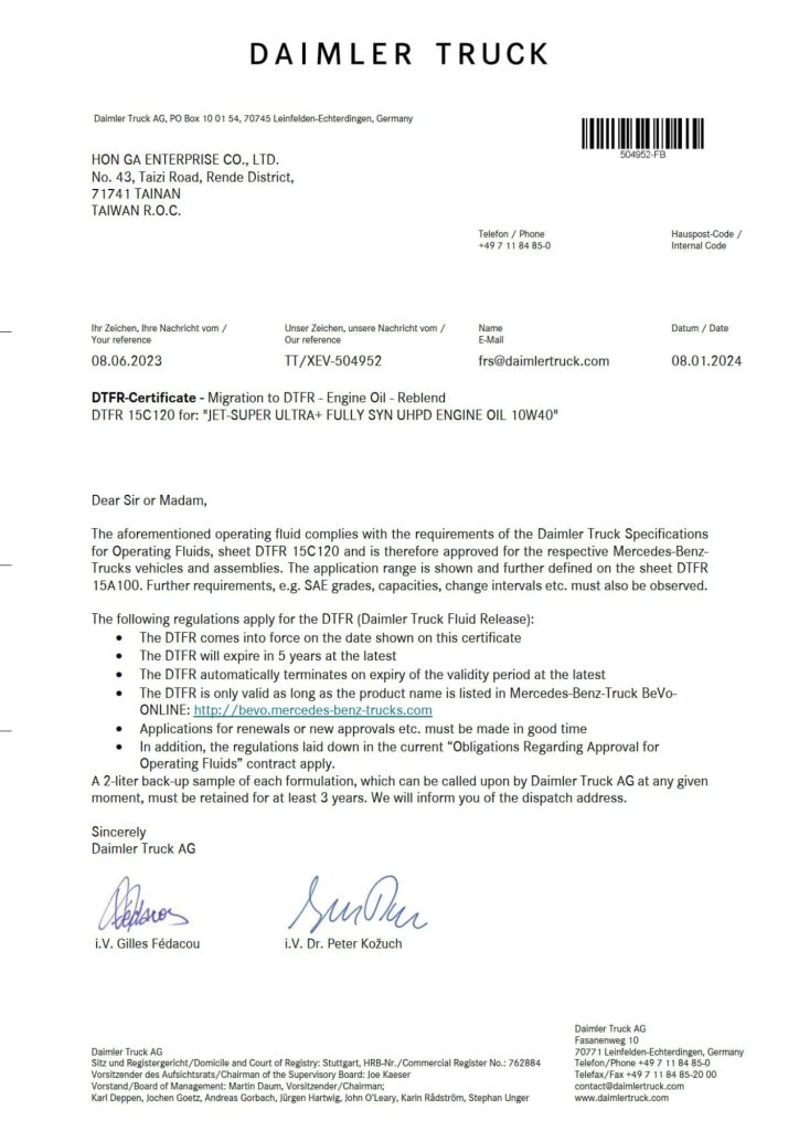 JET-SUPER ULTRA PLUS超頂級全合成引擎機油10W40 CK-4使用頂級基礎油及添加劑摻配製成,同時符合API CK-4及ACEA E4, E6, E7, E9規格,符合歐規六期環保標準,最新低硫磷灰配方,可與六期或之前後處理系統完全相容,即使在最嚴峻的操作環境下,亦能有效延長換油週期;高粘度指數使其在低溫保有高流動性,炎熱氣候下油膜強韌足夠。符合市面上幾乎所有歐洲及美洲車廠規範標準,包含賓士、MAN、Volvo、雷諾、達富等。
