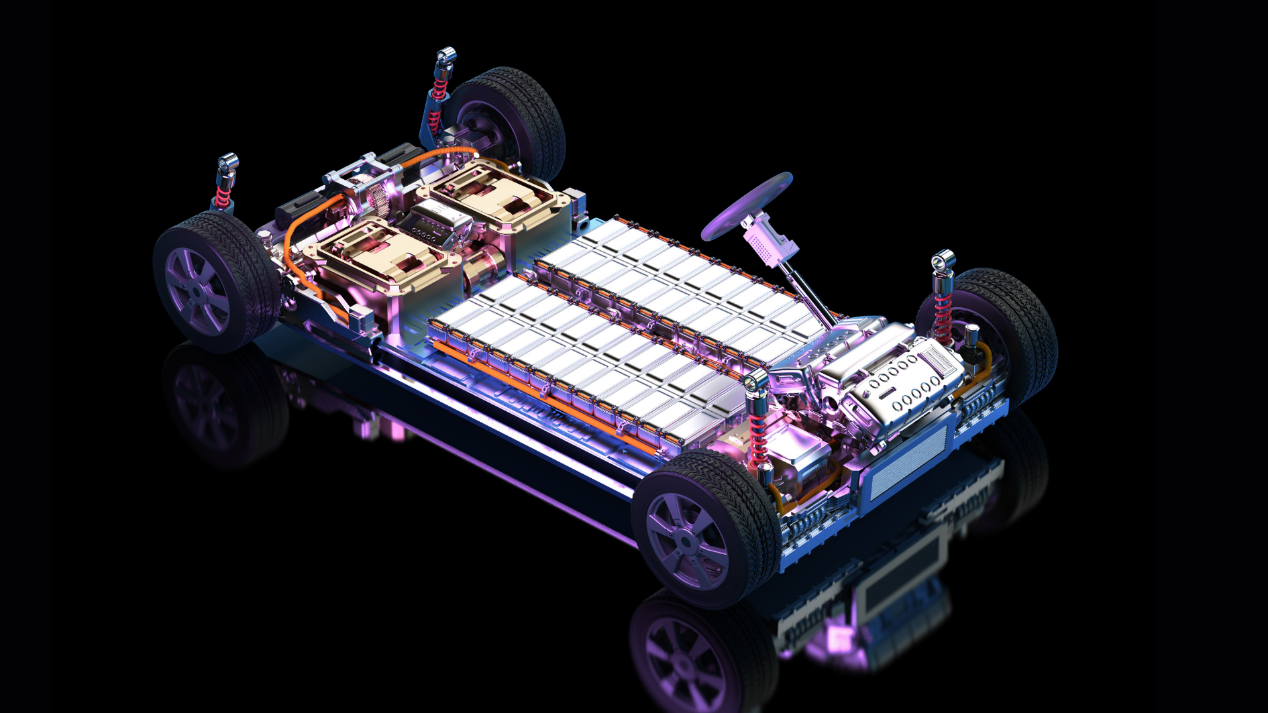 The Core of the EV: A transparent view of the EV chassis reveals the high-voltage battery pack and drive units arranged closely. These precision components require high-insulation e-Coolants for thermal management to prevent overheating and ensure driving safety.
